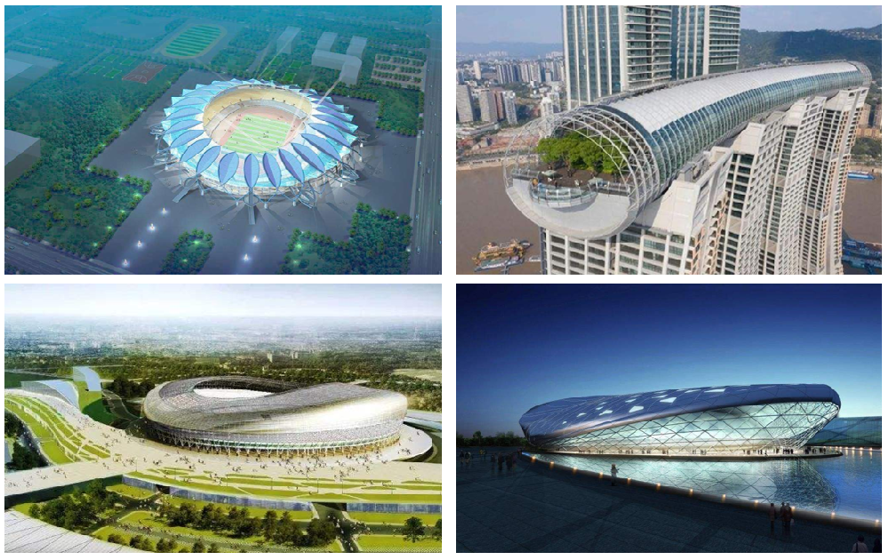 某广场空中连廊为亚洲最大空中连廊,全长300m,宽30m,高22.5m,高度约250m。该空中连廊的围护结构由82对(波峰+波谷)圆管构成,全面积约14100m2,是后续玻璃幕墙安装的骨架,其线形决定了玻璃幕墙尺寸。